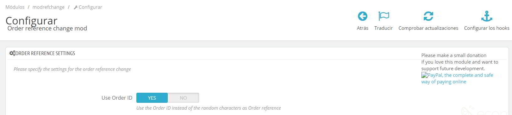 Una vez instalado simplemente tienes que marcar la primera opción «Use Order ID: Yes» para empezar a utilizar el ID de pedido como número de en lugar de los caracteres aleatorios que utiliza PrestaShop por defecto.